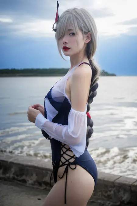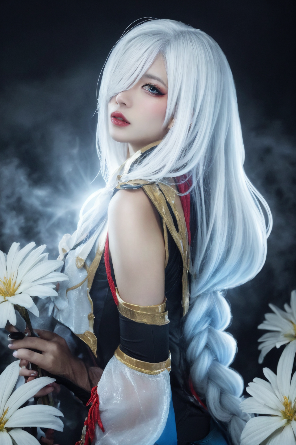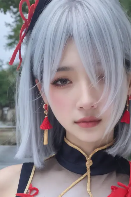 Shenhe (genshin impact ), 1Girl, solo, hair over one eye, Jewelry, tassel earings, earings, looking at viewer, long hair, lips, white hair, tassel, realistic, blue eyes, hair anonymous, grey eyes, one eye covered,