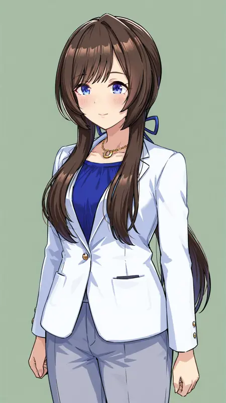 茶色の髪、長い髪、ネックレス、青い髪リボン、髪飾り、