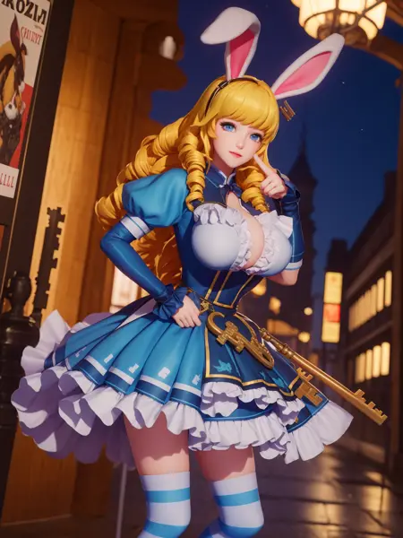 - WZRYdajiALSXJ,1girl,solo,rabbit ears,blonde hair,blue eyes,drill hair,dress,long hair,striped thighhighs,looking at viewer,frills,breasts,cityscape,night,mature female,cowboy shot,key,hand on hip,