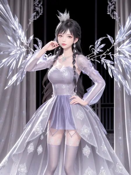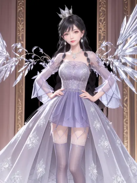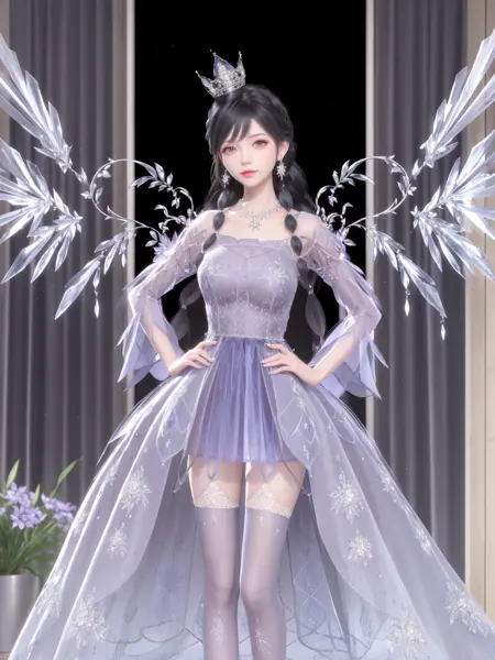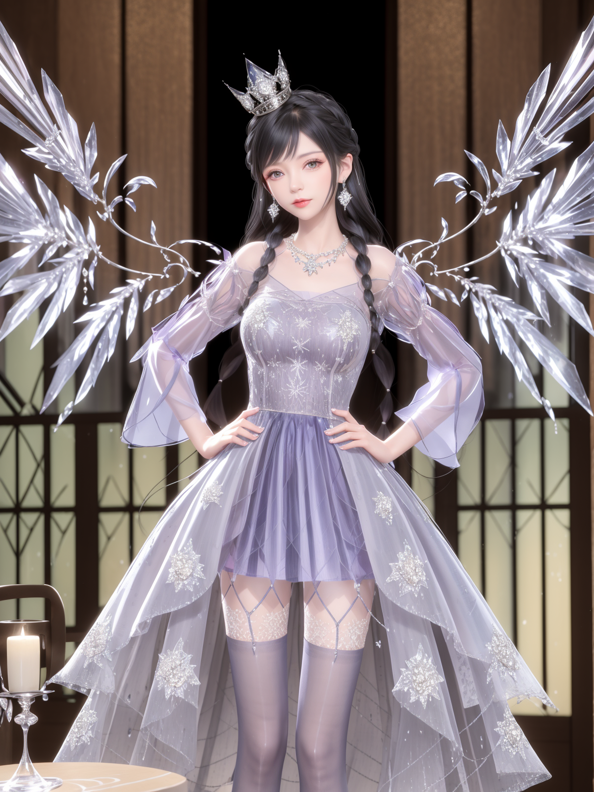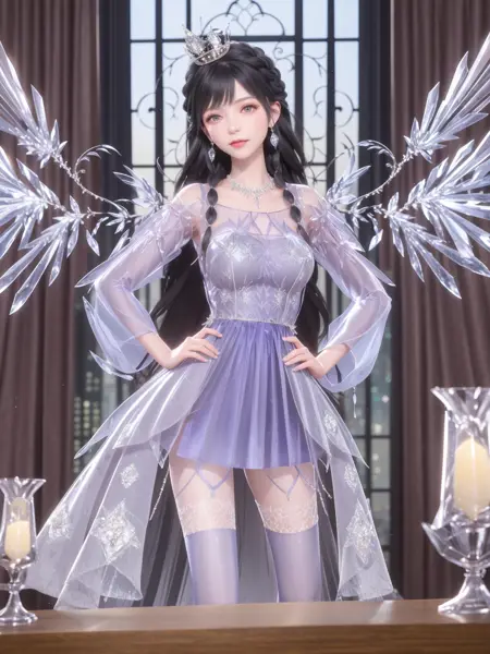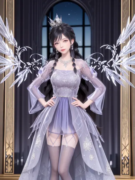 - SYNNJYZC,1girl, solo, black hair, jewelry, long hair, dress, thighhighs, crown, necklace, earrings, standing, see-through, looking at viewer, detached sleeves, braid, crystal, purple eyes, wings, (cityscape:1.2), night, mature female, cowboy shot, indoors, window, hand on hip,