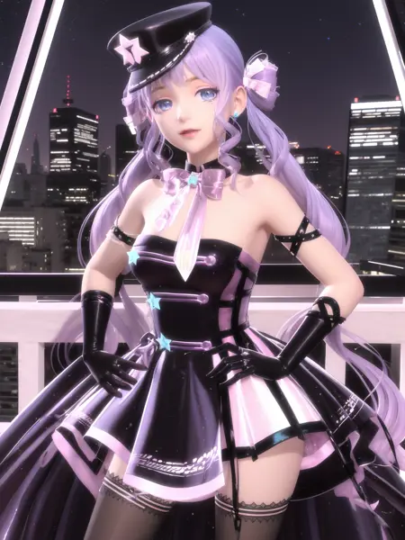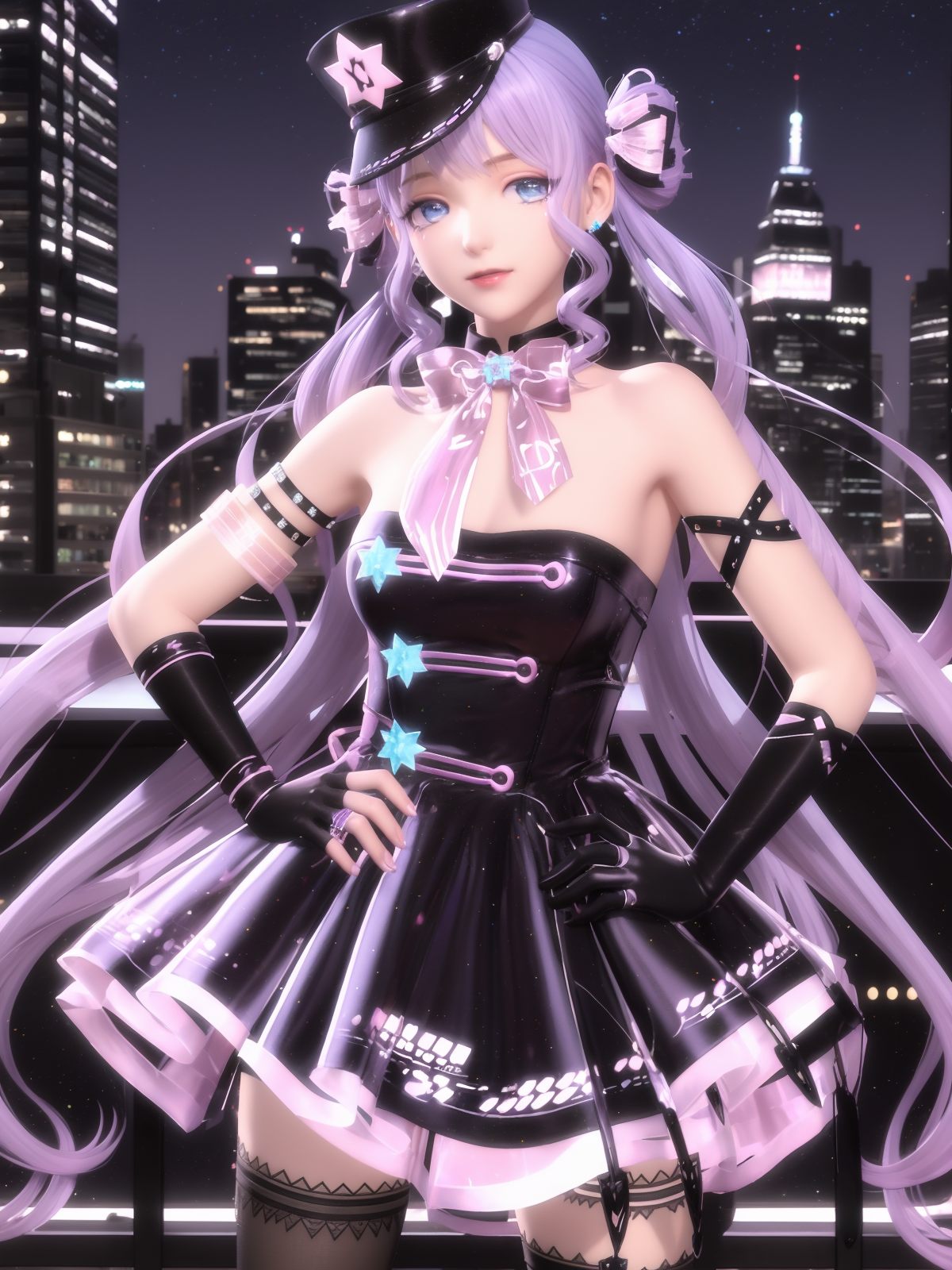 - SYNNyuwangzhiyin, 1girl, solo, hat, thighhighs, gloves, long hair, twintails, blue eyes, choker, looking at viewer, standing, star (symbol), asymmetrical legwear, dress, purple hair, black gloves, bow, jewelry, bare shoulders, cityscape, night, thigh strap,