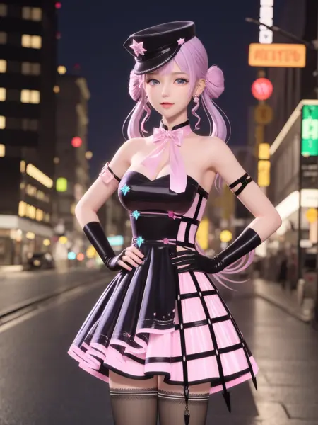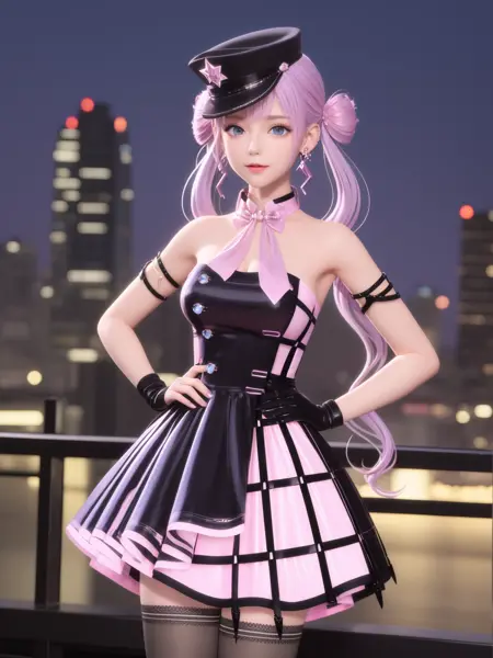 - SYNNyuwangzhiyin, 1girl, solo, hat, thighhighs, gloves, long hair, twintails, blue eyes, choker, looking at viewer, standing, star (symbol), asymmetrical legwear, dress, purple hair, black gloves, bow, jewelry, bare shoulders, cityscape, night, thigh strap,
