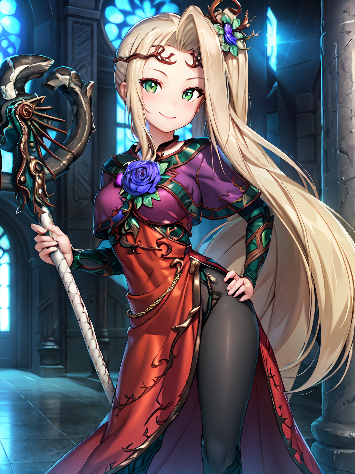 유용한 프롬프트: 1girl, 단독, 녹색 눈, 드레스, 꽃, 금발 머리, 지팡이, 지팡이 들고 있음