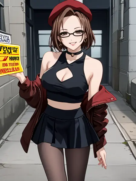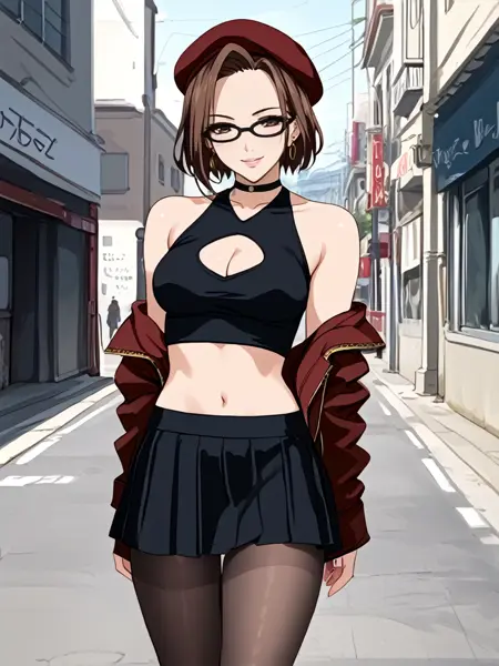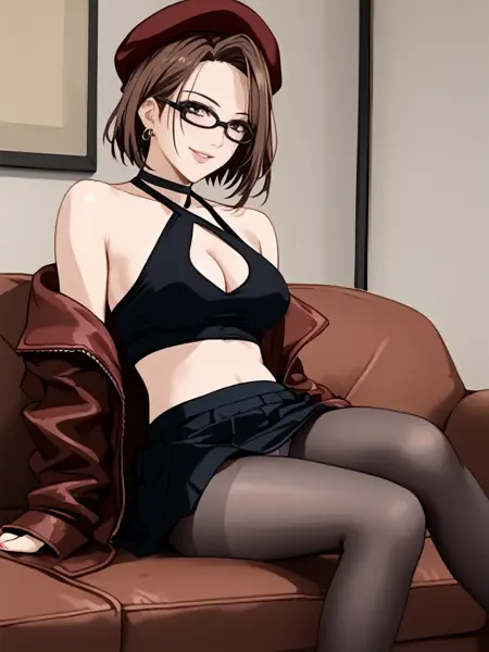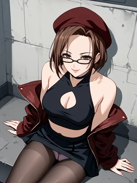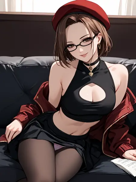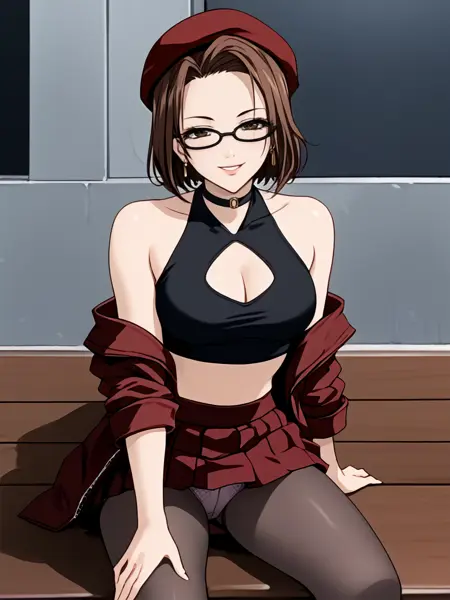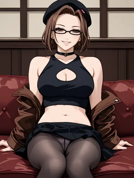 bare shoulders,cleavage cutout,beret,jacket,skirt,pantyhose,black midriff,panties,choker,earrings,