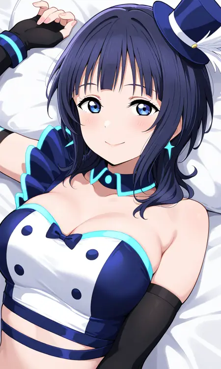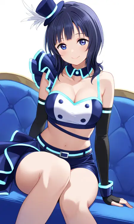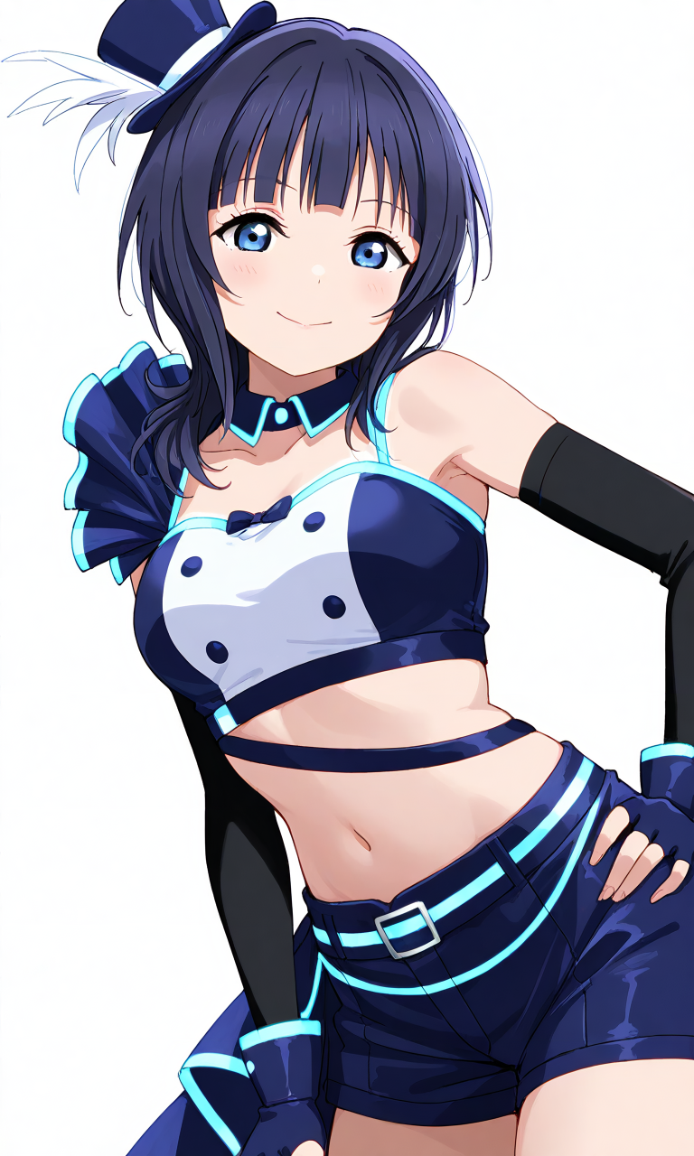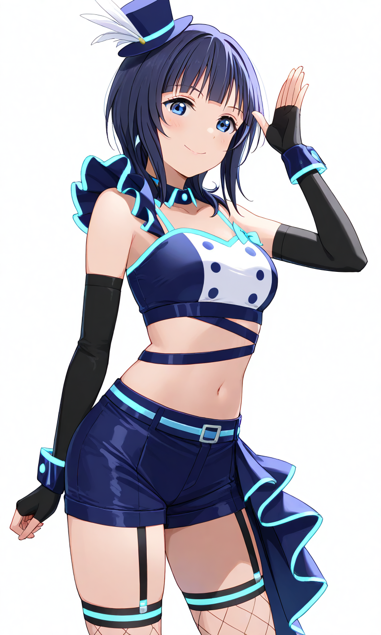 asaka karin \(love live\),vivid world \(love_live!\),short hair,blue hair,blue eyes,blue short,short short,midriff,crop top,mini top hat,blue hat,elbow sleeve,fingerless gloves,official alternate costume