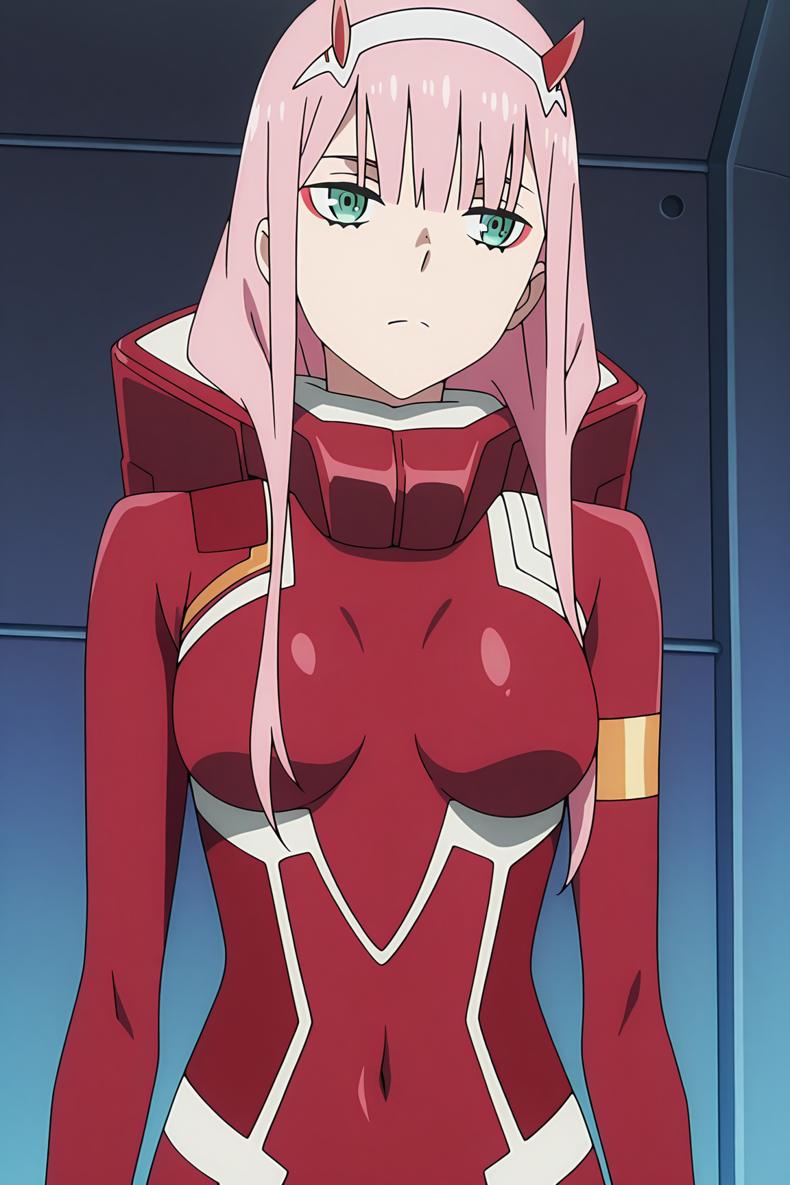 赤いボディスーツ、パイロットスーツ、中程度の胸、肌にぴったりとフィットする、