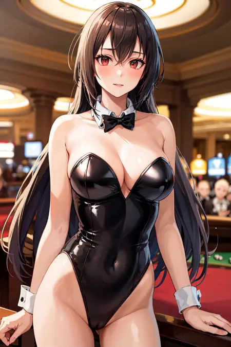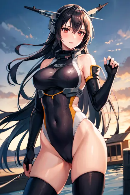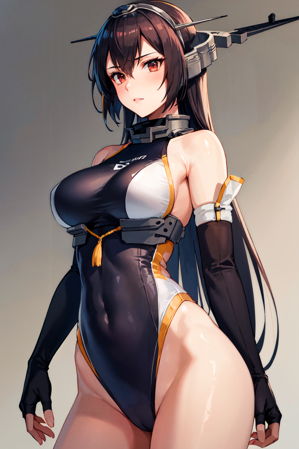 服装3aanagato, long hair, headgear, hairband, bare shoulders, one-piece swimsuit, fingerless gloves, elbow gloves, black gloves