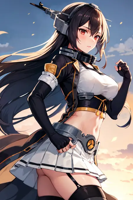 服装2aanagato, long hair, headgear, hairband, collar, coat, elbow gloves, fingerless gloves, black gloves, midriff, pleated skirt, white skirt, garter straps, thighhighs