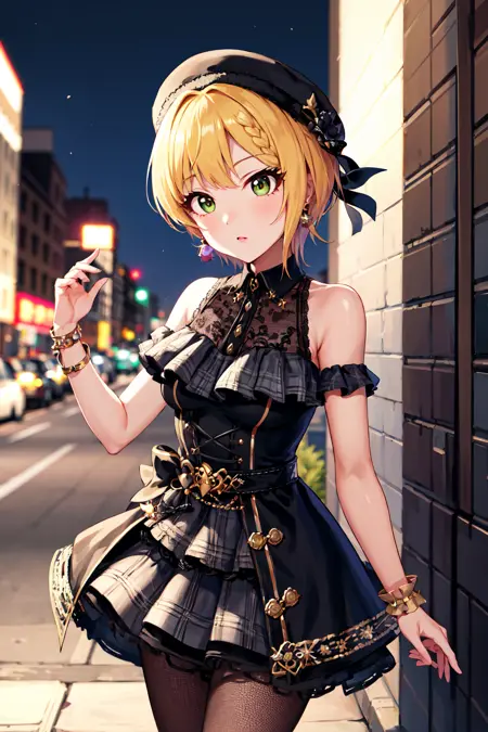 outfit2hmfre, blonde hair, braid, beret, black headwear, earrings, armlet, plaid, bare shoulders, black bow, black dress, wrist cuffs, bracelet, belt, fishnet pantyhose, idolmaster cinderella girls