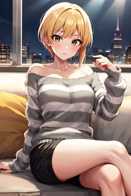 outfit3hmfre, blonde hair, collarbone, off shoulder, striped sweater, long sleeves, sleeves past wrists, black shorts, idolmaster cinderella girls