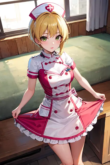 outfit5hmfre, blonde hair, beret, white headwear, earrings, choker, sailor collar, shirt, white bow, sleeveless, wrist cuffs, midriff, white skirt, see-through, idolmaster cinderella girls