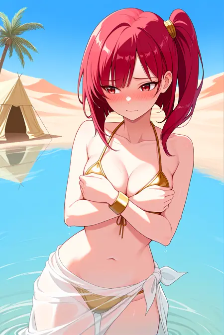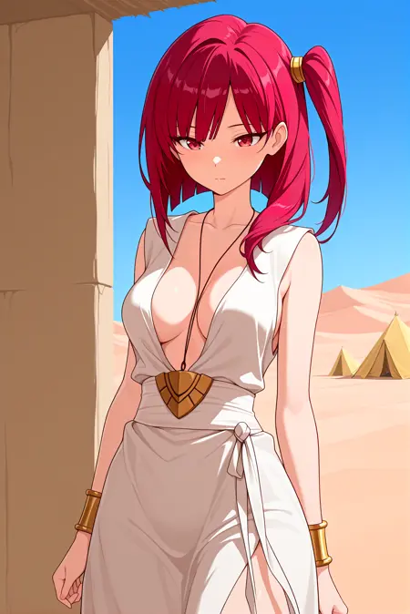동양식 외모: 붉은 머리카락, 붉은 눈, 긴 머리카락, 한쪽만 올린 스타일, 땋은 머리, 머리 장식,