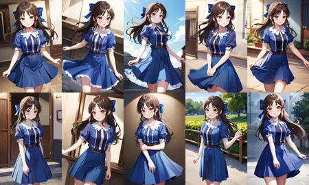 hmarisu, long hair, hair bow, blue bow, blue dress, collared dress, short sleeves, puffy sleeves, belt, blue skirt