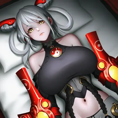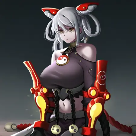 trigger words:1girl.qi1,short hair,large breasts, bare shoulders, jewelry, white hair, yellow eyes, clothing cutout,animal ears,red horn,forearm protection,exposed navel,navel,slim navel,hair rings,hair ornament,bodysuit,aov