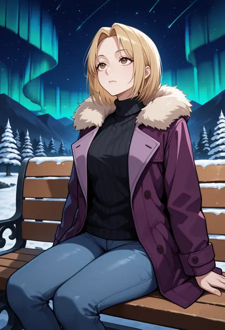 Default Outfit: purple jacket, suit jacket, long sleeves, purple skirt, pencil skirt, miniskirt, cleavage, large breasts