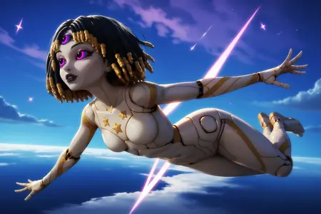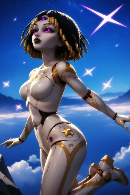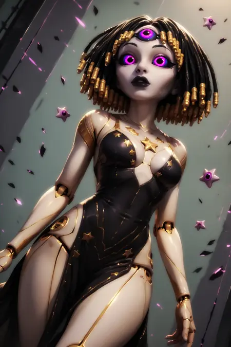 프롬프트: 1girl, android, black hair, purple eyes, pink eyes, dreadlocks, colored skin, joints, star (symbol), short hair, colored sclera, makeup, medium breast, grey skin, black lips, third eye
