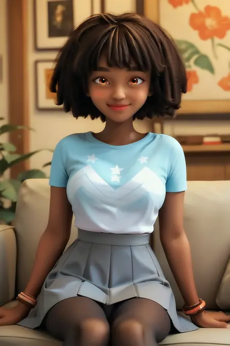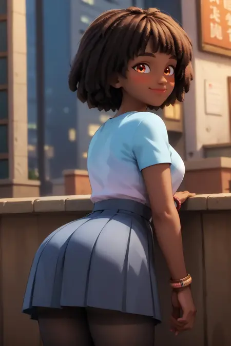 Prompts : 1girl, dark skin, dark-skinned female, brown hair, brown eyes, bangs, short hair, large breast