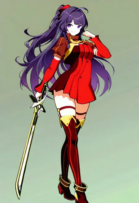 금장식이 있는 갈색 짧은 재킷, 금사슬, 부푼 어깨, 분리된 소매, 붉은 소매, 붉은 주름치마 드레스, 짧은 드레스, 가슴 노출 컷아웃, 붉고 검은 허벅지 부츠, 금장식이 있는 발목 고리
