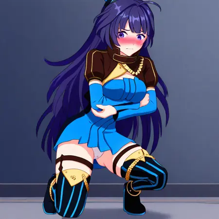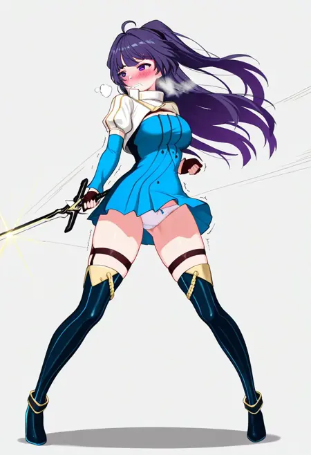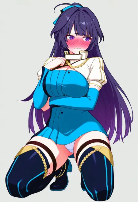 RaidenMei3rd, 1girl, solo, 어두운 보라색 머리카락, 헤어 벤츠, 보라색 눈, 아호게, 둔한 앞머리, 흰색 짧은 재킷(금장식), 금사슬, 부篷 어깨, 분리된 소매, 파란 소매, 파란 주름치마 드레스, 짧은 드레스, 가슴 노출 컷아웃, 파랑과 검은 허벅지 부츠, 금장식이 있는 발목 고리