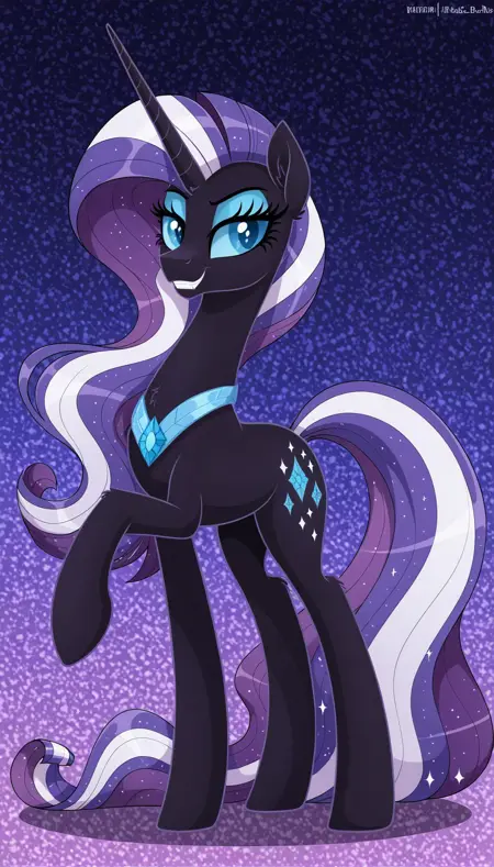 Hairstyle: A lush and long mane, styled in waves and falling to one side. The tail is just as voluminous and long, with graceful curves.