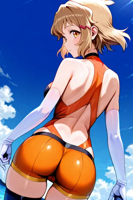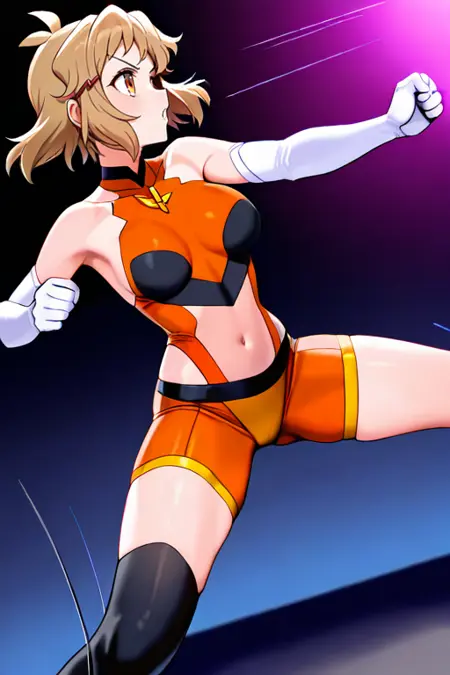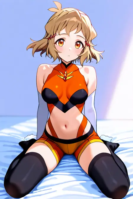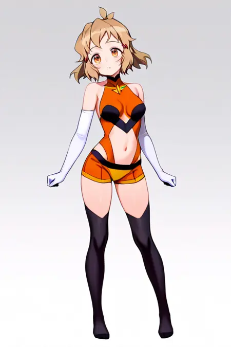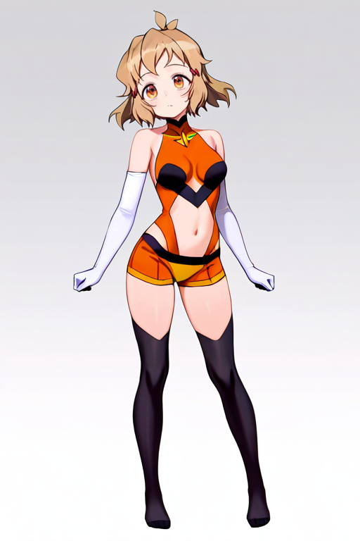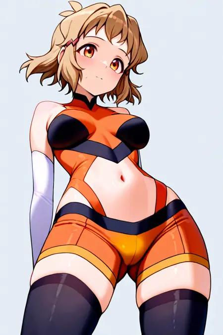 中等胸部, hibikidef, 裸露肩膀, 肚脐, 橙色紧身衣, 短裤, 肘部手套, 白色臂套, 黑色过膝袜, 紧身, 锁骨装饰,