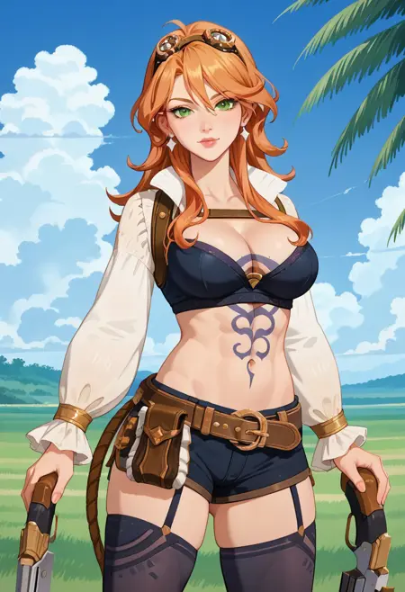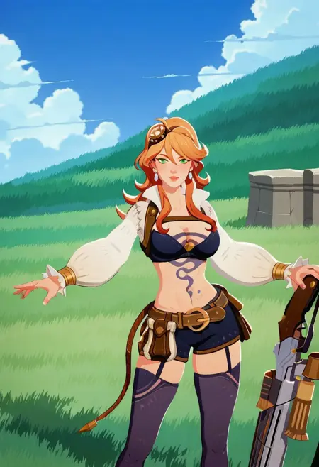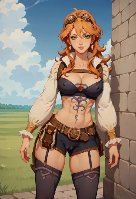 AtalantaAFK, 1个女孩, 单人, 长发, 橙色头发, 波浪发, 绿眼睛, 嘴唇, 耳环, 头戴护目镜, 单眼眼镜, 大乳房, 纹身, 暴露的胸部, 黑色露脐上衣, 蓬松袖子, 白色袖子, 腰带, 短裤, 肚脐, 腹部, 腹股沟, 领子, 厚大腿, 吊袜带, 黑色过膝袜, 靴子, 包囊, 武器, 弩