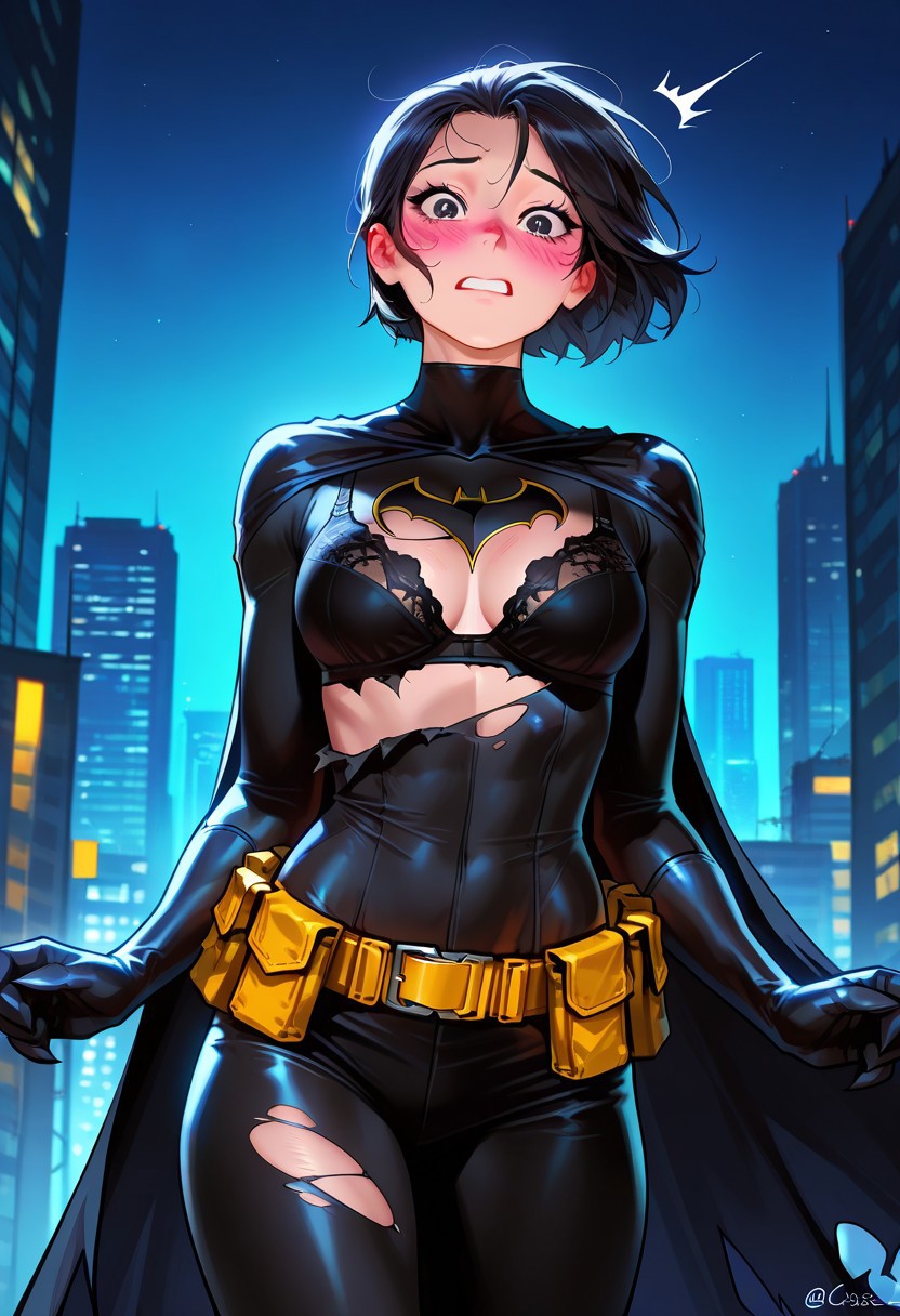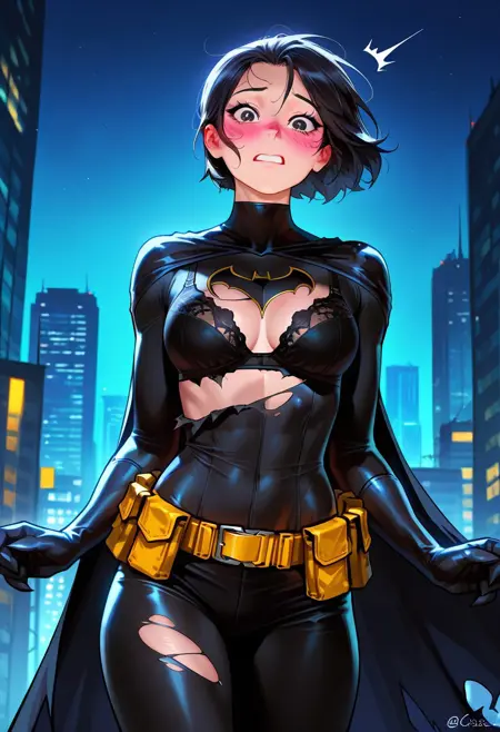 Batgirl costume trigger: Batgirl_Costume, black bodysuit, utility belt, cape,
