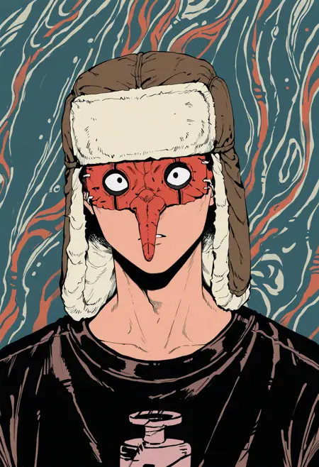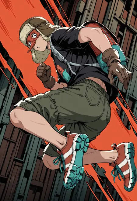 茶色の帽子、ウシャンカ、天狗の仮面、赤い仮面、アイマスク、黒いシャツ、Tシャツ、バックパック、レザーストラップ、緑のショートパンツ、尖った靴、スニーカー、赤い靴、白い靴