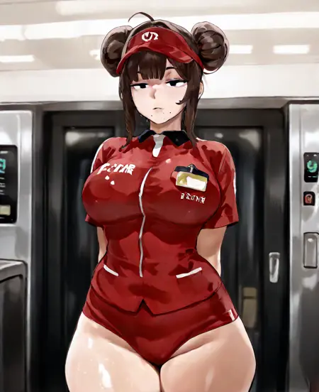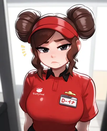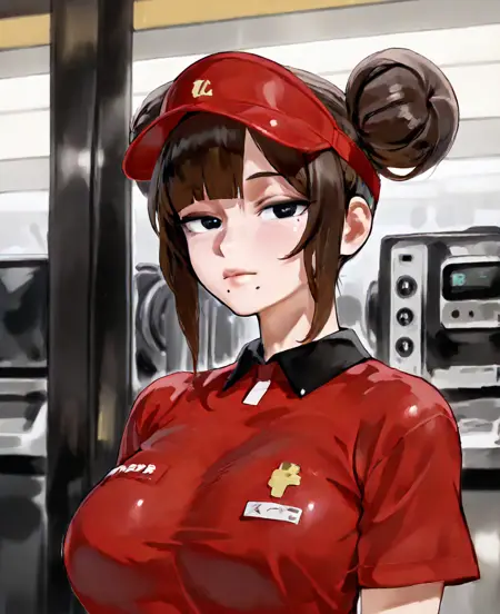 Prompt: lora:boss:1, boss_(gats), hair bun, double bun, mole under mouth, visor cap,brown hair, employee uniform, black eyes, red_shirt,