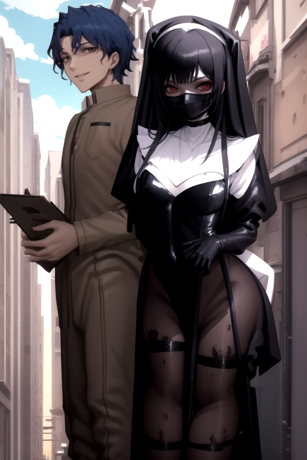ShinjiCberpnkNun, a man and a woman, hetero, standing, smile, cowboy shot