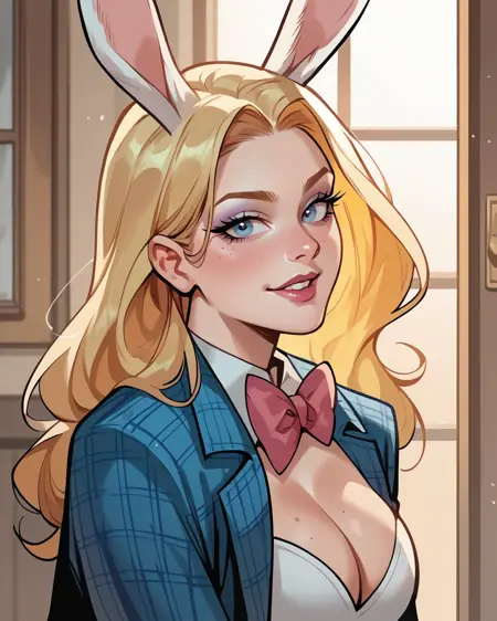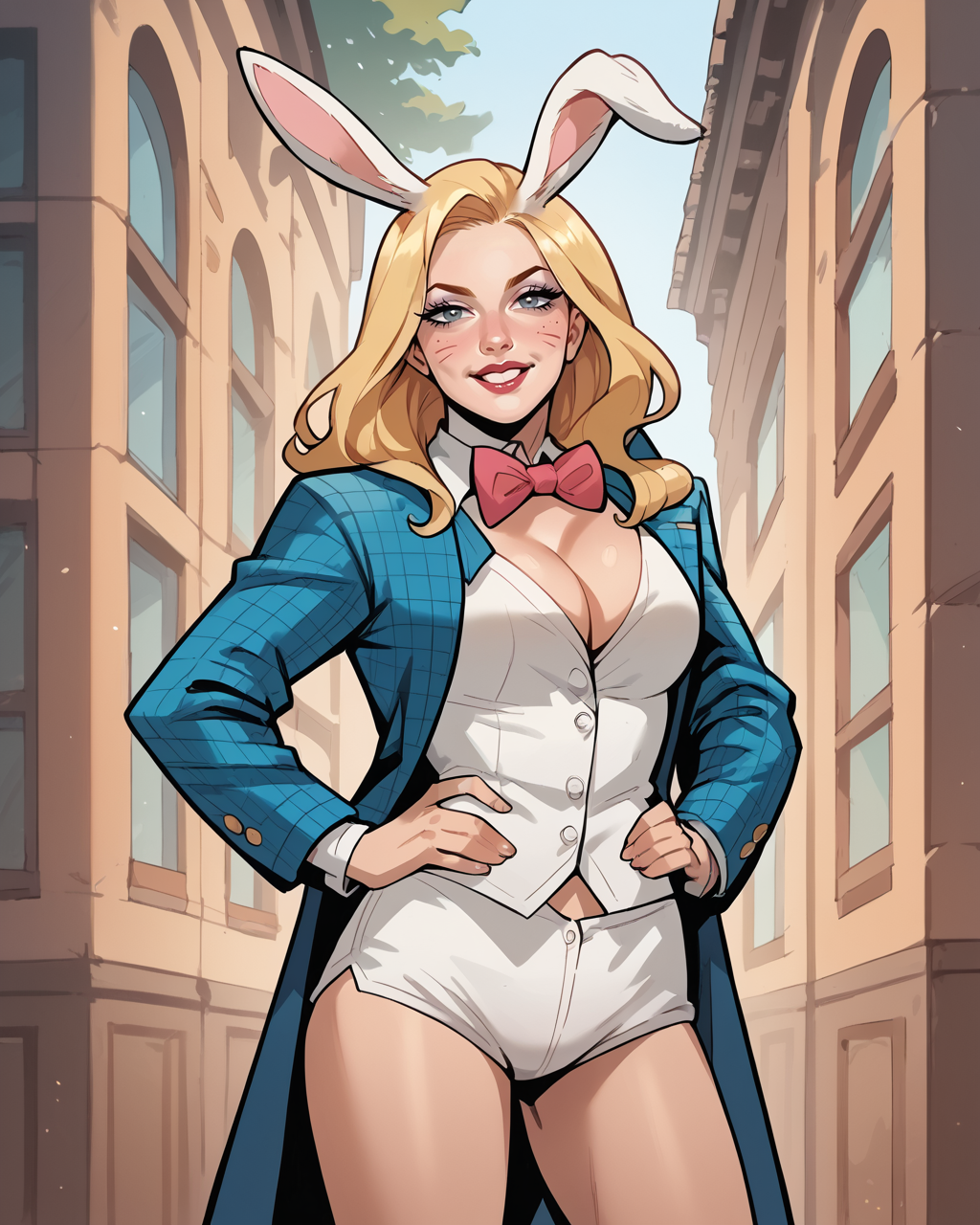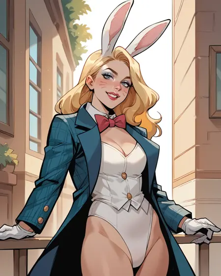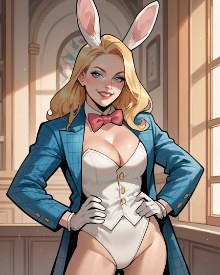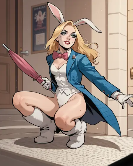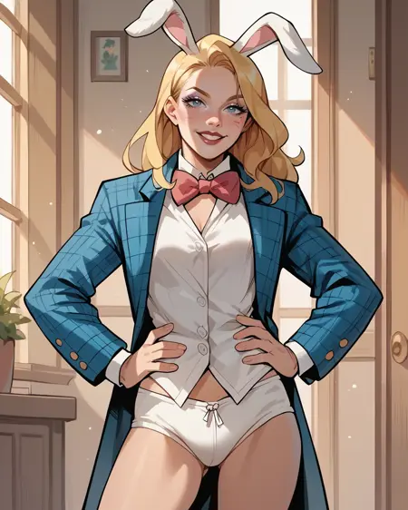트리거: whiterabbit, 긴 머리, 금발, 토끼 귀, 메이크업, 리본 넥타이, 조끼, 테일코트, 속옷, 반바지