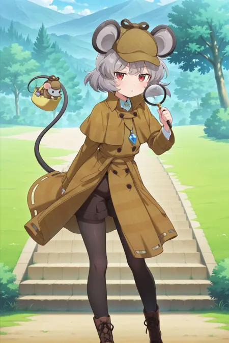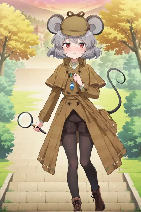 nazrin, 1girl, solo, red eyes, grey hair, short hair, mouse ears, mouse tail, nazrin \(genius mouse detective\), alternate costume, brown hat, deerstalker, plaid hat, pendant, blue gemstone, detective, brown capelet, collared capelet, plaid capelet, brown coat, plaid coat, long sleeves, collared shirt, black shorts, black pantyhose, brown boots, lace-up boots, holding, magnifying glass,