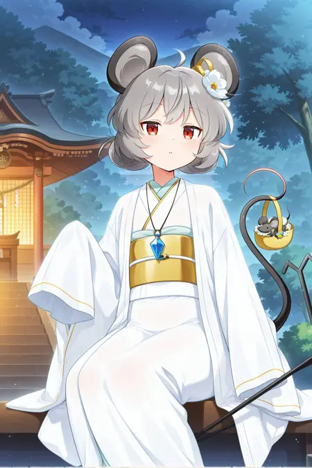 nazrin, 1girl, solo, red eyes, grey hair, short hair, mouse ears, mouse tail, nazrin \(white mouse searching for whats been lost\), alternate costume, ahoge, hair flower, hair ornament, pendant, blue gemstone, japanese clothes, white kimono, wide sleeves, sleeves past fingers, sleeves past wrists, silver obi, gold obijime, gold obiage, white sash, basket, white flower, white dowsing rod,