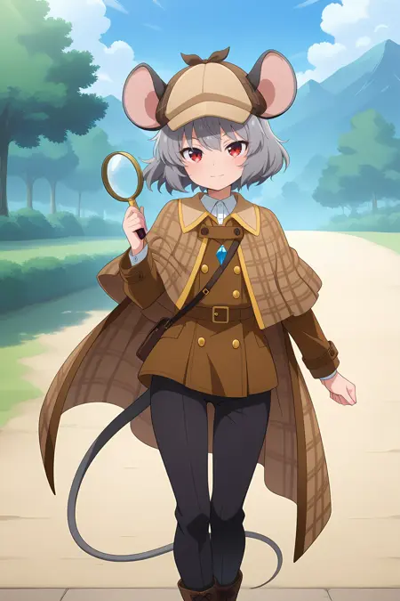 nazrin, 1girl, solo, red eyes, grey hair, short hair, mouse ears, mouse tail, nazrin \(天才鼠类侦探\), 改装服装,帽子,猎鹿帽,侦探,棕色外套,格子外套,棕色短披风,有领短披风,格子短披风,有领衬衫,黑色长裤,手持放大镜,首饰,靴子,棕色鞋履,