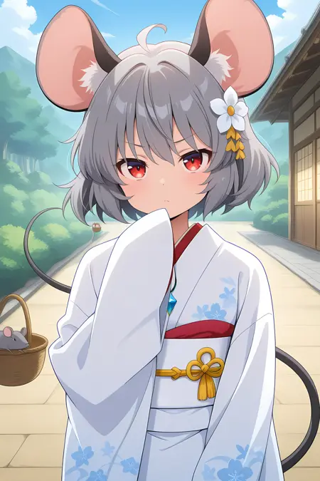 nazrin, 1girl, solo, red eyes, grey hair, short hair, mouse ears, mouse tail, nazrin, 呆毛, 替代服装, 发饰花, 发饰, 和服, 和服, 腰带, 带扣, 吊坠, 白色和服, 白色腰带, 宽袖, 袖子过指尖, 袖子过手腕, 篮子, 白色花朵,