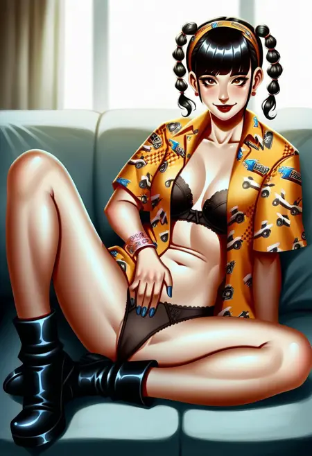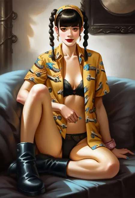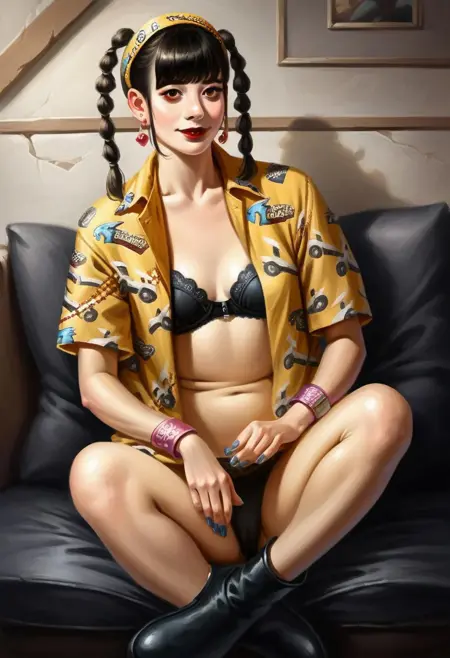 衣装: "黄色のプリントシャツ、白いTシャツ、ベルト、黒のショートパンツ、ピアス、黒のアンクルブーツ"