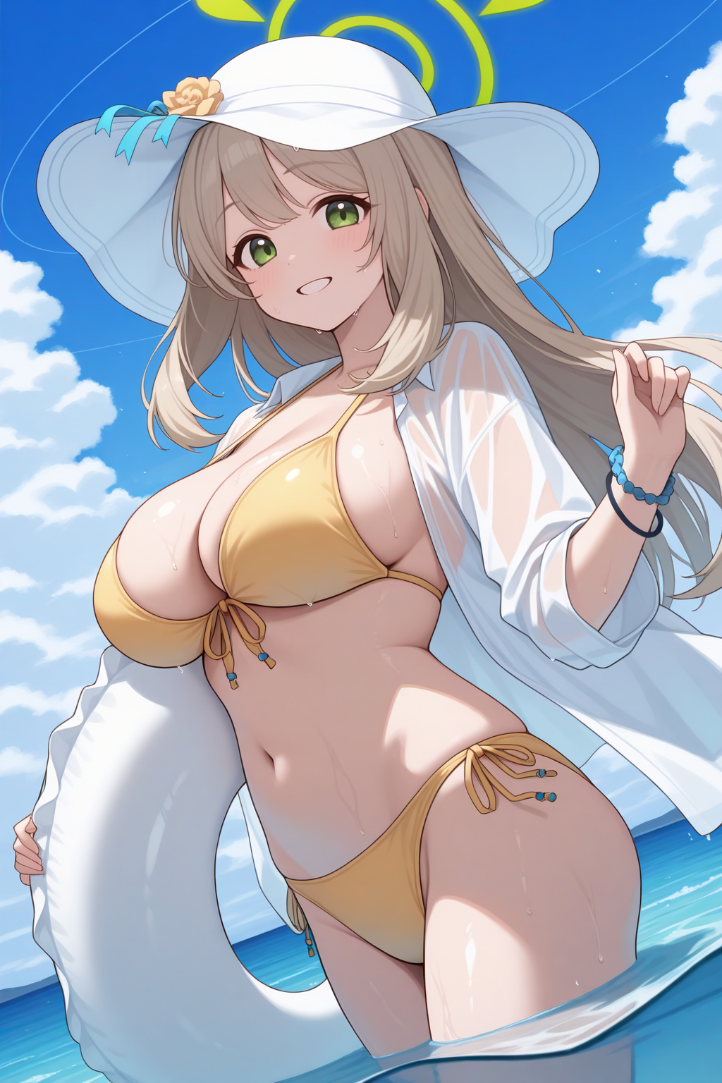 수영복: 흰색 모자, 모자 리본, 모자 꽃, 흰색 반투명 셔츠, 벌어진 셔츠, 노란 비키니, 스트링 비키니, 앞쪽 매듭 비키니 상의, 측면 매듭 비키니 하의, 구슬 팔찌