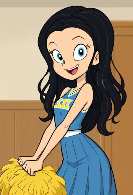 Outfit: blue cheerleading top with design, blue cheerleading skirt, white flat shoes