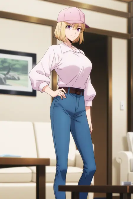 <lora:ChaHaeIn-IL-v3-08:0.9>, ChopioCha, 金色头发,头发遮住眼睛,紫色眼睛,注视观众,