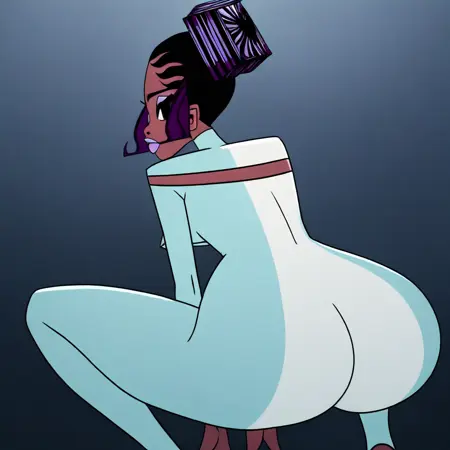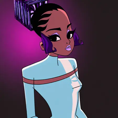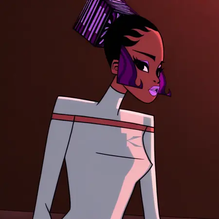 Claire, dark skin, black eyes, dark hair, hair bun, purple eyeshadow, purple lipstick, blue full bodysuit, wide chest opening, off shoulder, long sleeves, white stripe,