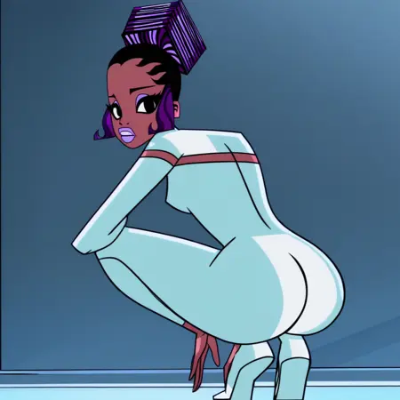 Claire, dark skin, black eyes, dark hair, hair bun, purple eyeshadow, purple lipstick, blue full bodysuit, wide chest opening, off shoulder, long sleeves, white stripe,