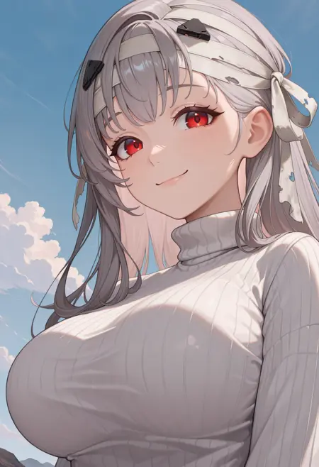 moderniarnd, red eyes, grey hair, long hair, bangs, large breasts, hair ornament, bandaged head