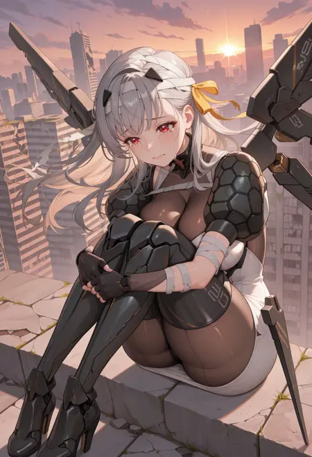 moderniadef, 붉은 눈, 회색 머리카락, 긴 머리, 앞머리, 헤어 리본, 노란 리본, 머리 장식, 머리에 붕대 감기, 바디스톡킹, 가슴 노출, 어깨 갑옷, 흰 드레스, 손가락 없음 장갑, 메카 무스메, 큰 가슴, 허벅지 부츠