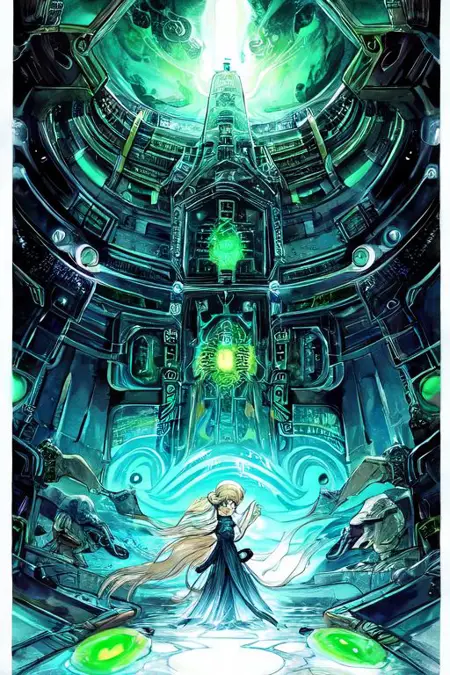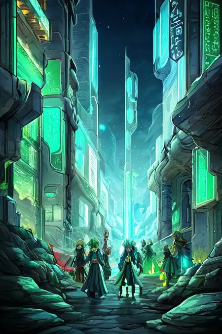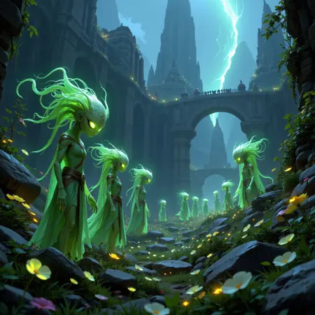 고요한 초원, 생물발광, 그리고 고등한 형태의 고세균이 거주하는 생물권 도시 풍경. 이 장면은 그들의 투명한 피부에서 발산되는 강렬한 생물발광에 의해 밝혀지며, 클로버 녹색, 라임 녹색, 에메랄드 녹색으로 구성된 아름다운 색조의 빛이 고대 석조 건축물 전체를 부드럽게 비춘다. 고세균들은 빛나는 홍채를 가진 커다란 아몬드 모양의 눈으로 특징지어지며, 이 눈은 주변 어둠을 뚫고 드리우는 듯하다. 그들의 머리카락, 혹은 머리카락처럼 생긴 부속물들은 매혹적인 빛을 내며 흔들리고 맥동하여, 이 수중 수호자들의 신비로운 매력을 더한다. 그들은 자연광과 조화를 이룬 유기적이고 반투명한 소재로 만든 옷을 입고 있으며, 학문적인 성향을 드러내는 우아하고 단정한 자세로 움직인다. 고세균들은 서로 교류하며, 그들의 네온 빛나는 정맥이 자신들이 수호하는 원시 몸체의 본질에서 파생된 독특한 능력을 사용할 때 더욱 밝게 빛난다. 도시 풍경은 미래적 건축과 고대 유적의 혼합으로, 그들의 지식의 깊이와 장구한 문명의 역사를 암시한다. 동일한 유기적 발광 소재로 제작된 다양한 유물과 고급 기술들이 장면 곳곳에 흩어져 있으며, 이는 그들이 지혜의 수호자라는 역할을 강조한다. 전반적인 분위기는 조화와 경외의 느낌으로, 그들이 보호하는 행성의 생명력과 깊이 연결되어 있음을 시각적으로 증명한다. 극 close-up