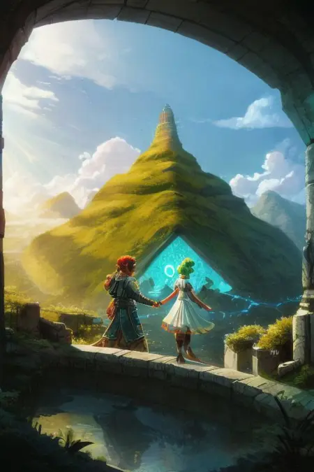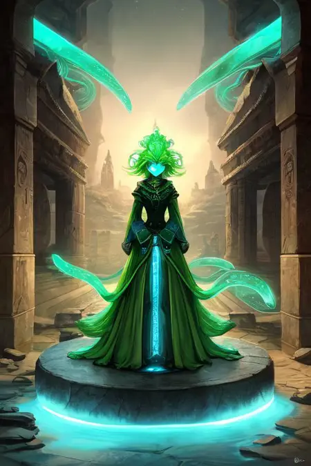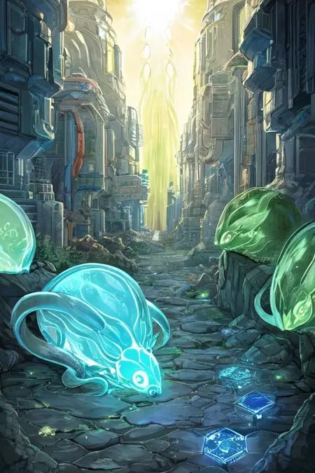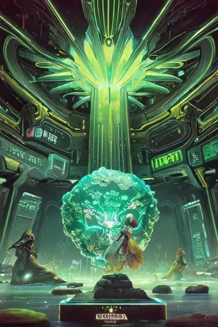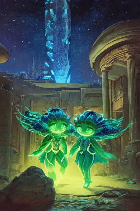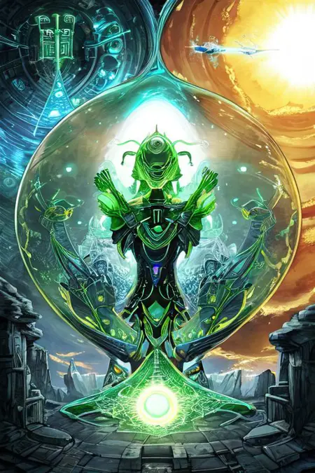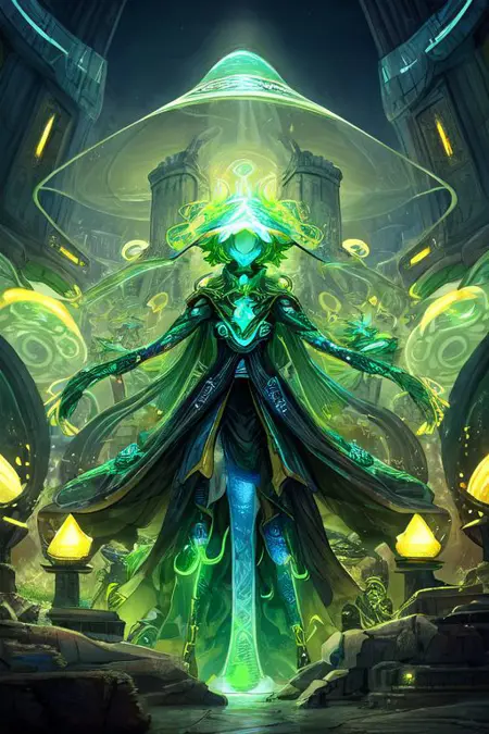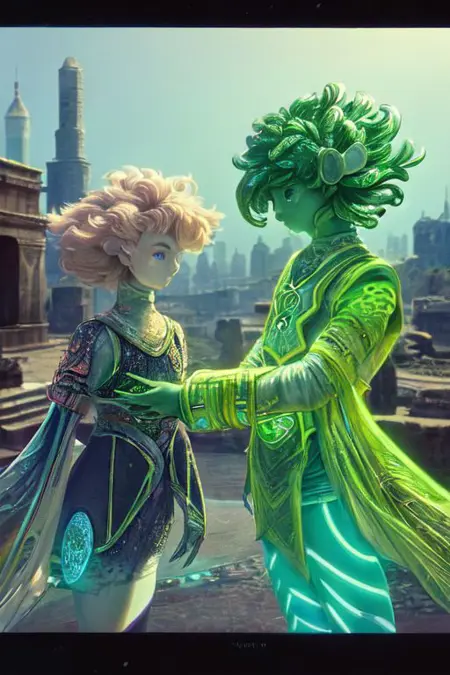 A serene meadow, bioluminescence, and weirdness like biosphere cityscape inhabited by the Archaea, a race of advanced beings with humanoid forms. The scene is illuminated by the hard bright bioluminescence emanating from their translucent skin, which shimmers in a symphony of shamrock green, lime green, and emerald green, casting a gentle glow across the ancient stone structures. The Archaea are distinguished by their large, almond-shaped eyes with luminous irises that seem to pierce through the surrounding darkness. Their hair, or rather hair-like tendrils, sway and pulse with a mesmerizing glow, adding to the enigmatic allure of these aquatic guardians. Dressed in garments made from organic, semi-transparent materials that harmonize with their natural light, they move with a poised grace that speaks to their scholarly nature. The Archaea are seen interacting with one another, their neon glowing veins pulsing brighter as they engage in the use of their unique abilities, which are drawn from the very essence of the proto-body they protect. The cityscape is a blend of futuristic architecture and ancient ruins, hinting at the depth of their knowledge and the long history of their civilization. Various artifacts and advanced technology, crafted from the same organic glowing materials, are scattered throughout the scene, emphasizing their role as custodians of wisdom. The overall atmosphere is one of harmony and reverence, a visual testament to their deep connection with the life force of the planet they safeguard., extreme close-up