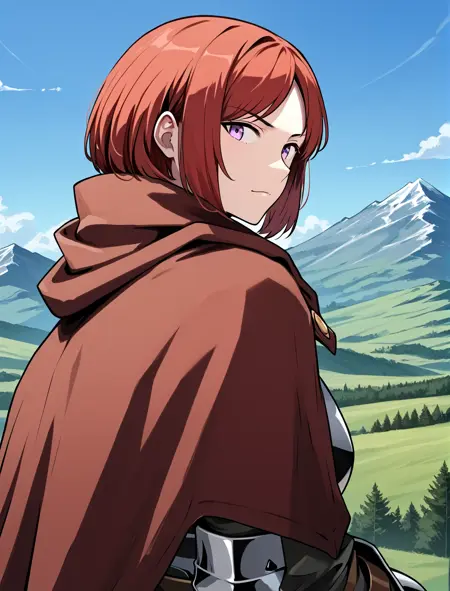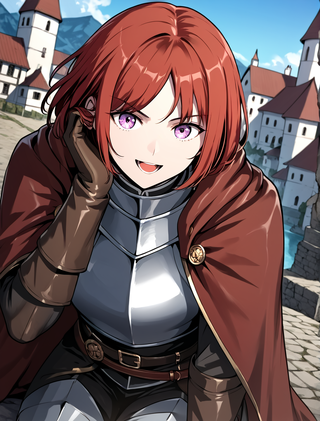 1 girl, solo, red hair, short hair, parted bangs, purple eyes