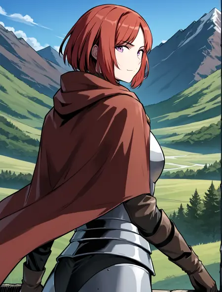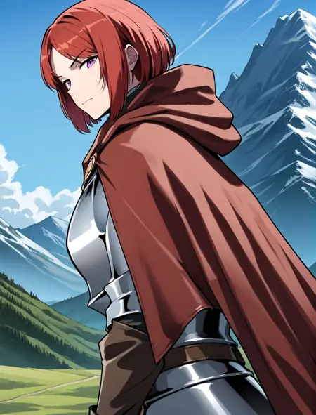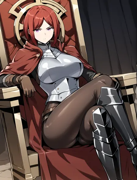 armor, brown gloves, red cape, breastplate, cloak, armored pants