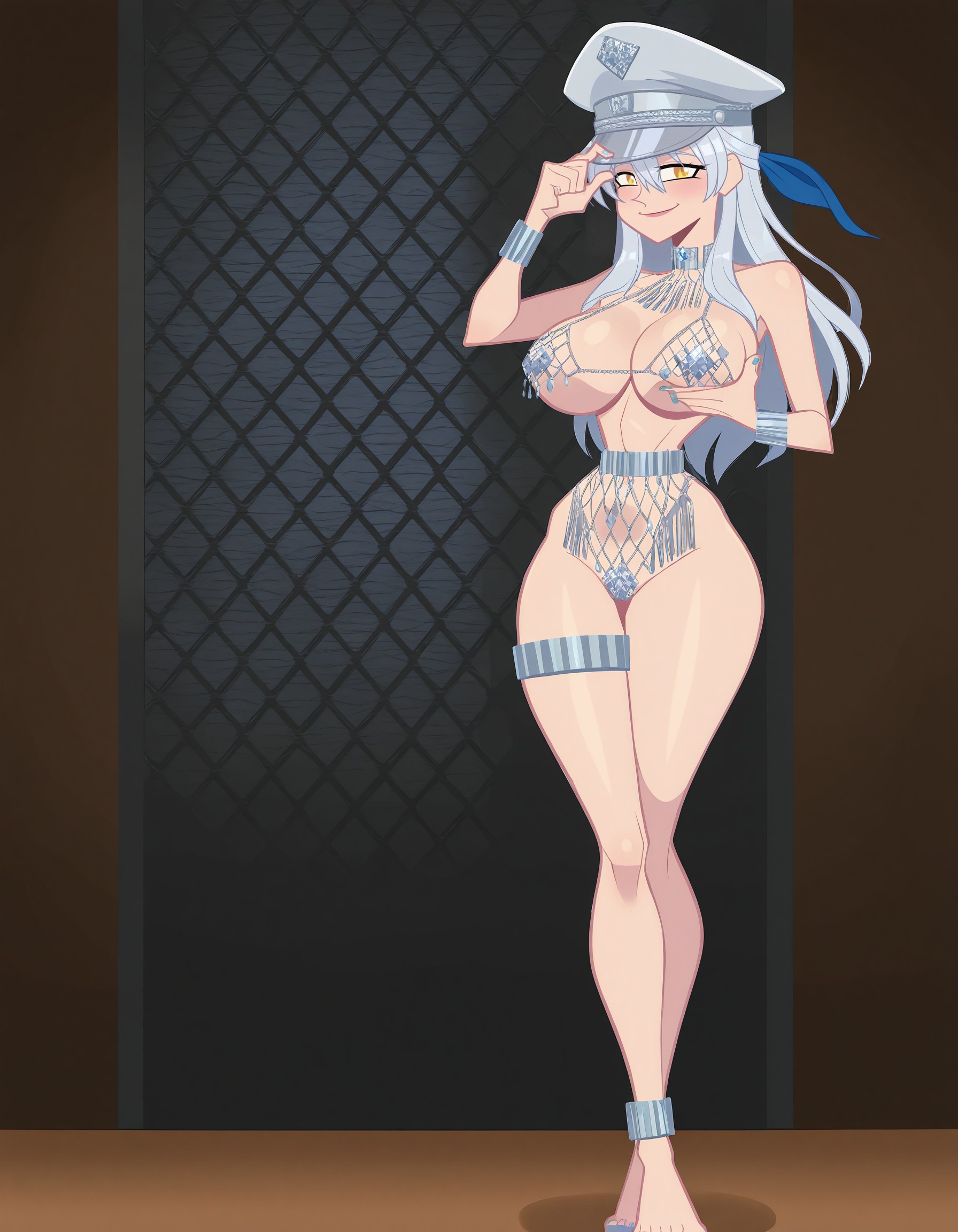 | 训练词汇 | silver peaked cap, diamond peaked cap, diamond encrusted peaked cap, diamond tassels on peaked cap, tassels covering eyes, silver choker, diamond choker, diamond tassels on choker, silver bikini, silver fishnet bikini, gate patterned bikini, see-through bikini, diamond bikini, diamond encrusted bikini, diamond pasties, silver torso band, diamond tassels on torso band, diamond encrusted torso band, silver wrist band, diamond wrist band, diamond encrusted wrist band, silver fingernail polish, diamond fingernail polish, diamond encrusted fingernail polish, DMNDG4L 已复制! |
