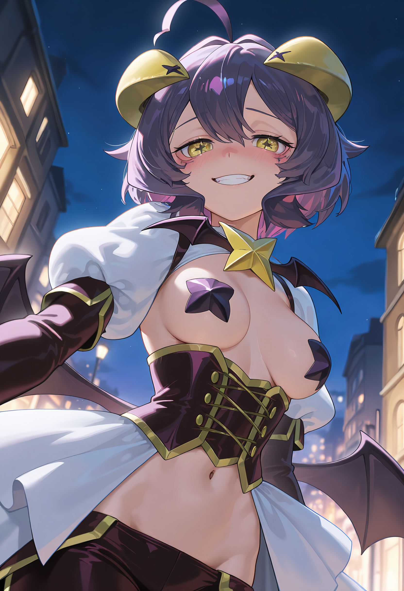 Tags for her look (Magia Baiser): 1girl, solo, medium breasts, purple hair, short hair, ahoge, yellow eyes, black star-shaped pupils,