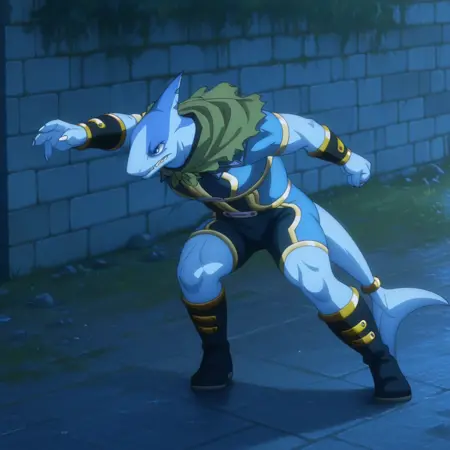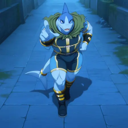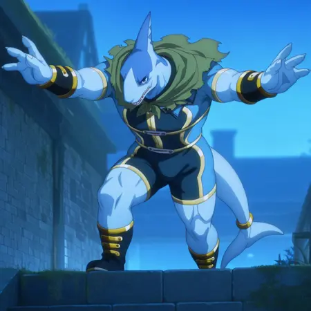 Arabaslfil, anthro, male, shark, blue skin, blue eyes, gold trimmed blue bodysuit, gold armbands, gold trimmed dark blue bracers, gold trimmed dark blue boots, green capelet, gold tail ring,